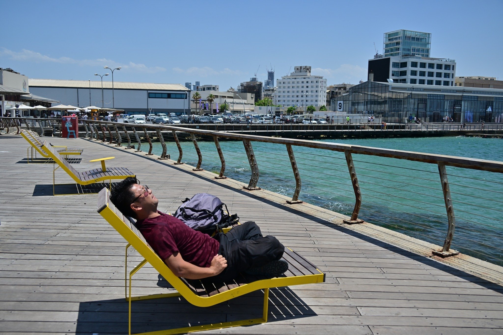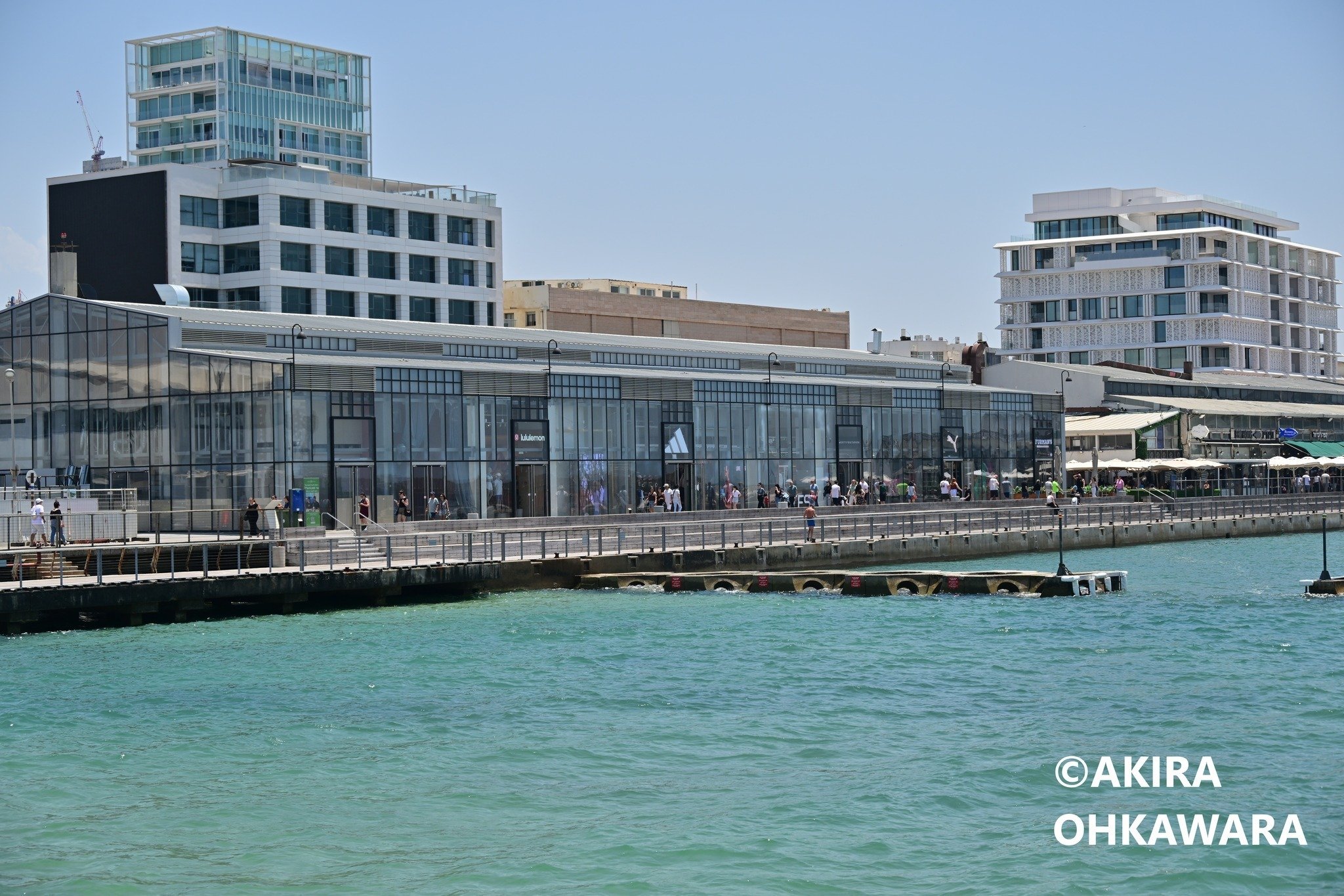 テルアビブの港周辺はブランド店や飲食店が数多く建ち並んでいる地区。週末ともなれば数多くの人々がくる場所となっています。寝椅子も置かれており、昼寝をする人や釣りする人々も多くいました。